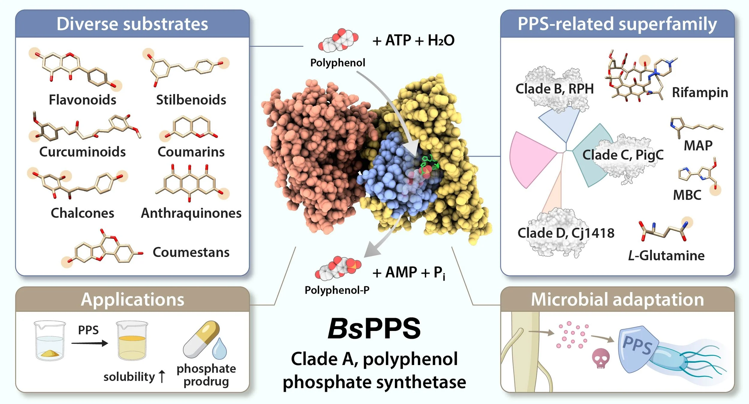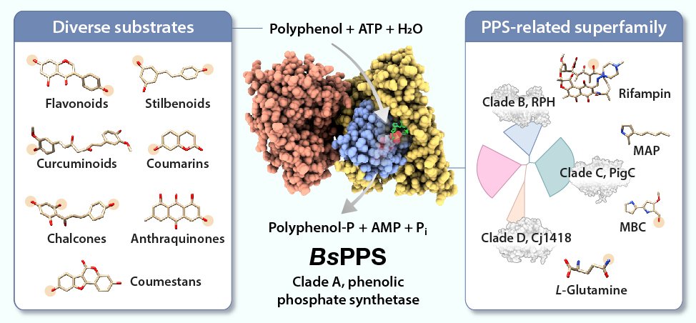 本文介紹了枯草桿菌的新型二激酶 BsPPS,它能精準對黃酮、薑黃素等”多種”多酚進行磷酸化,基質的多樣性是這個酵素的特性之一。同時作者也針其他分群做了演化上的分析。此研究揭示了其獨特的催化機制與受質結合區域,為開發磷酸前驅藥物與生物催化工具箱開闢了新路徑。