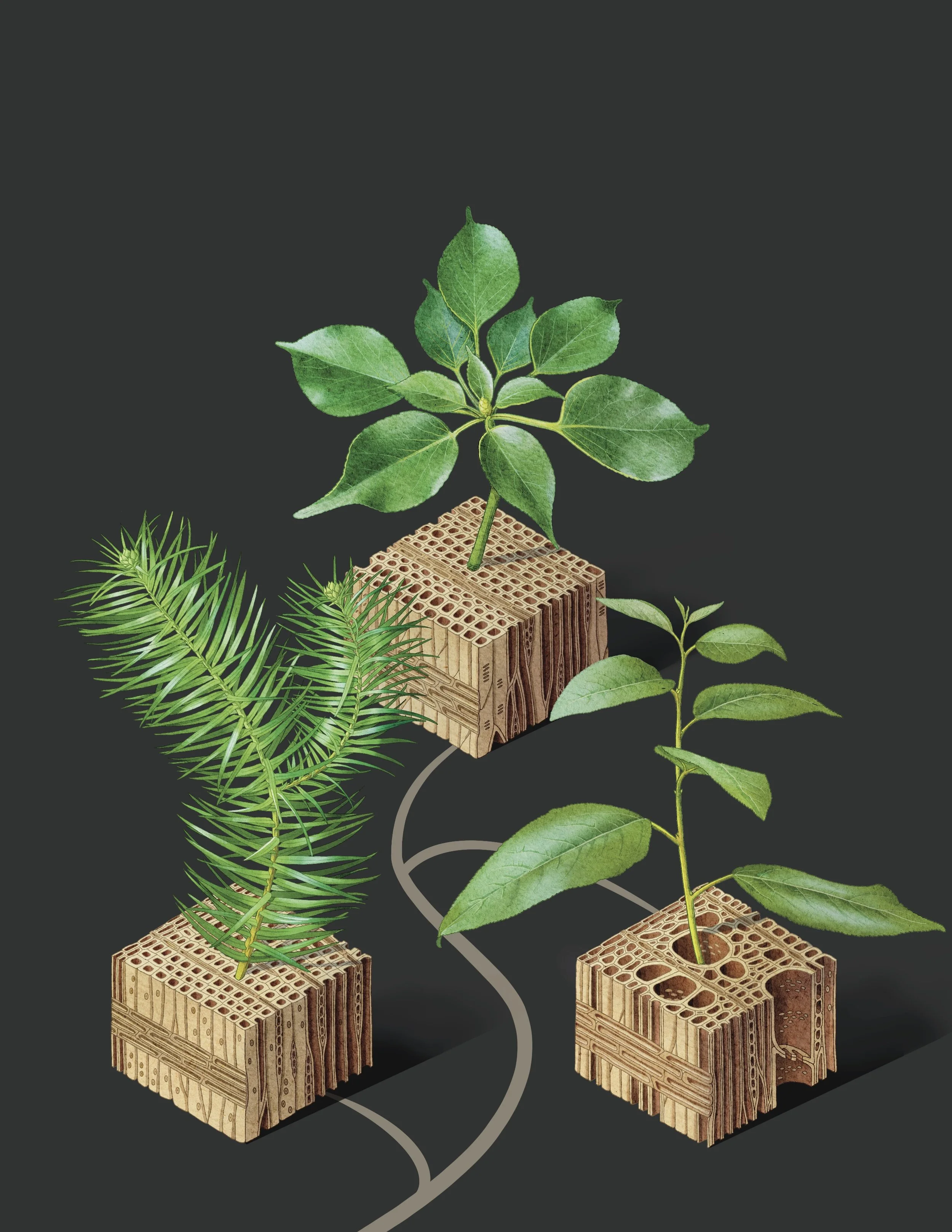 圖中將木質部的構造設計得像一個方塊盒子,可以觀察三個面向的剖面。它像是擺在桌上的小花瓶,象徵木質部負責運送水分,提供上方的枝條養分。從剖面上也可以明顯發現莖的構造有所不同,右下的毛果楊具有明顯的導管 (大空洞)。